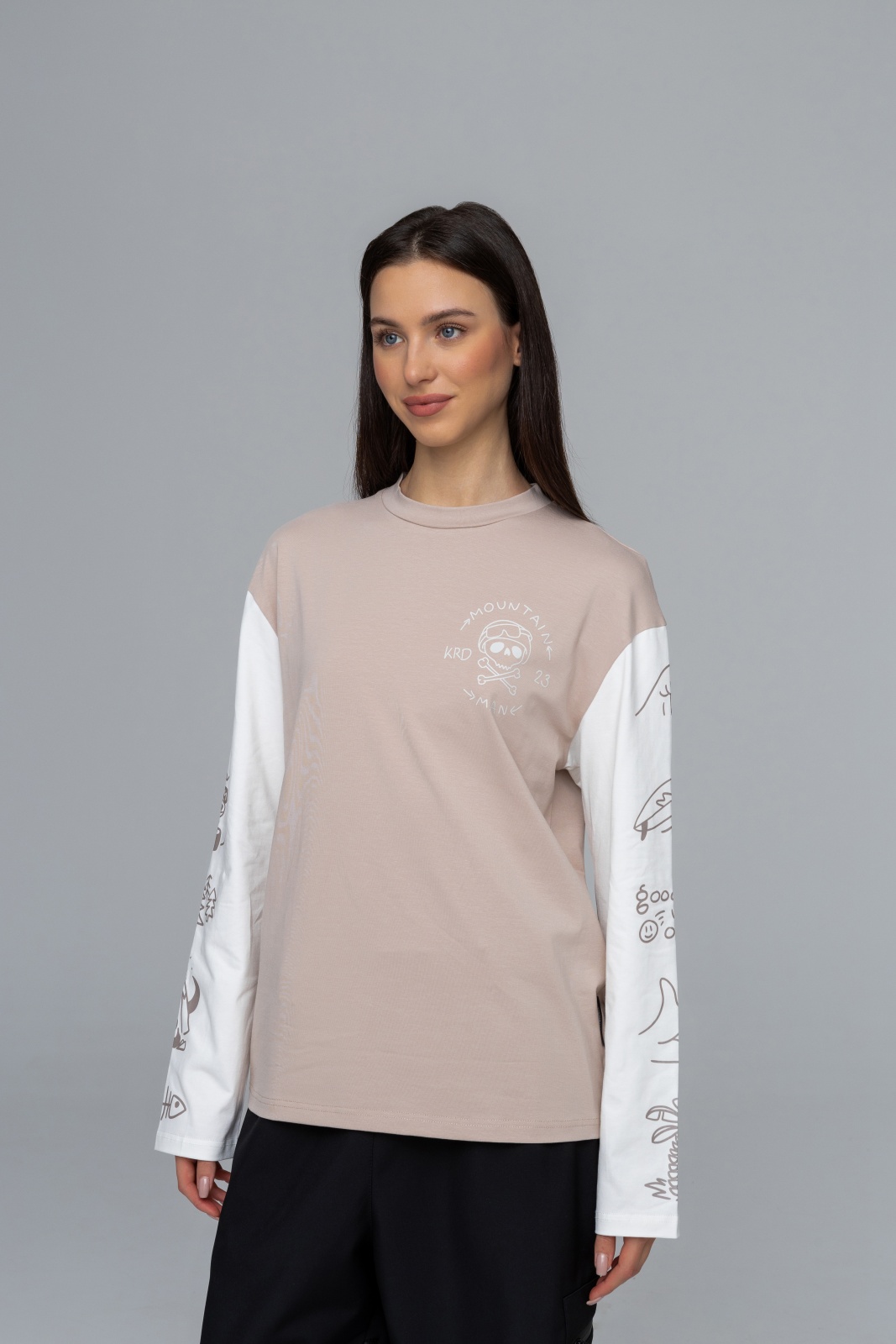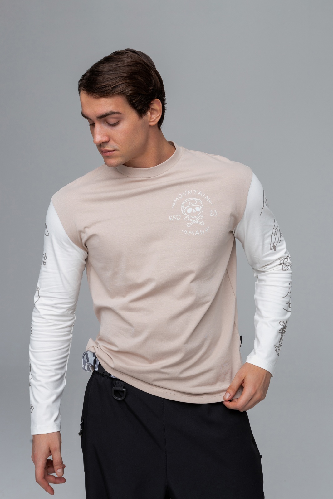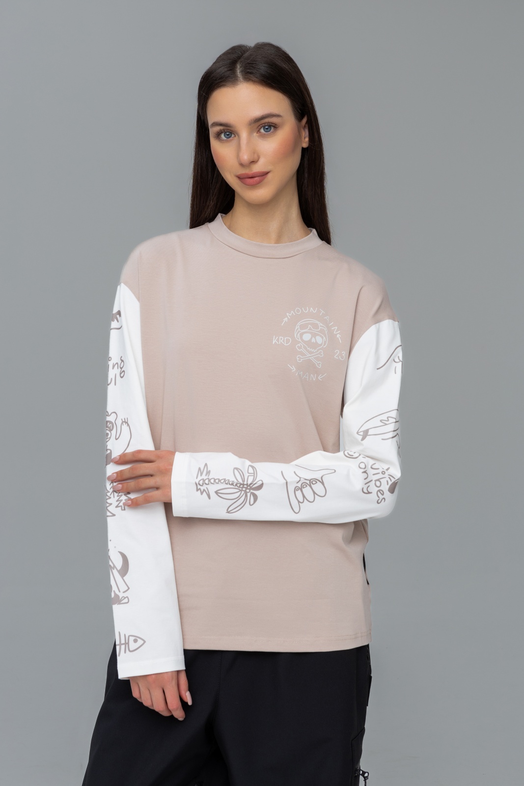 Изготовлен из кулирной глади с добавлением эластана — приятный на ощупь материал, который хорошо тянется и дышит. Такой лонгслив комфортен при температуре от +15 до +30°C и станет отличным вариантом на весну, лето и тёплую осень. Принт добавляет характер изделию, а грамотный уход сохранит его надолго.